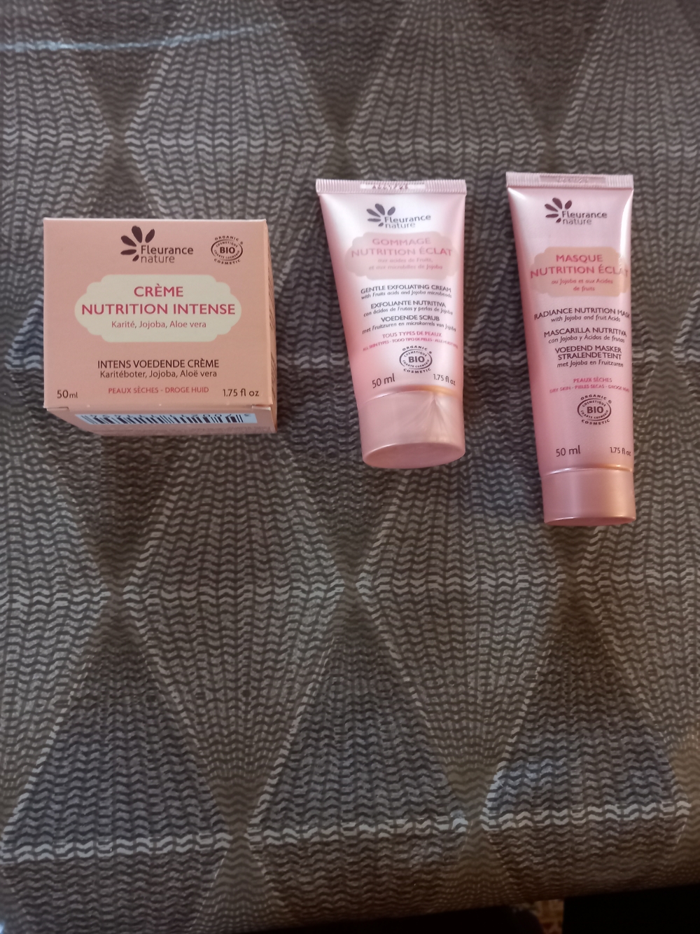 3 produits bio Fleurance Nature nutrition éclat (gommage, masque et crème nutrition intense)