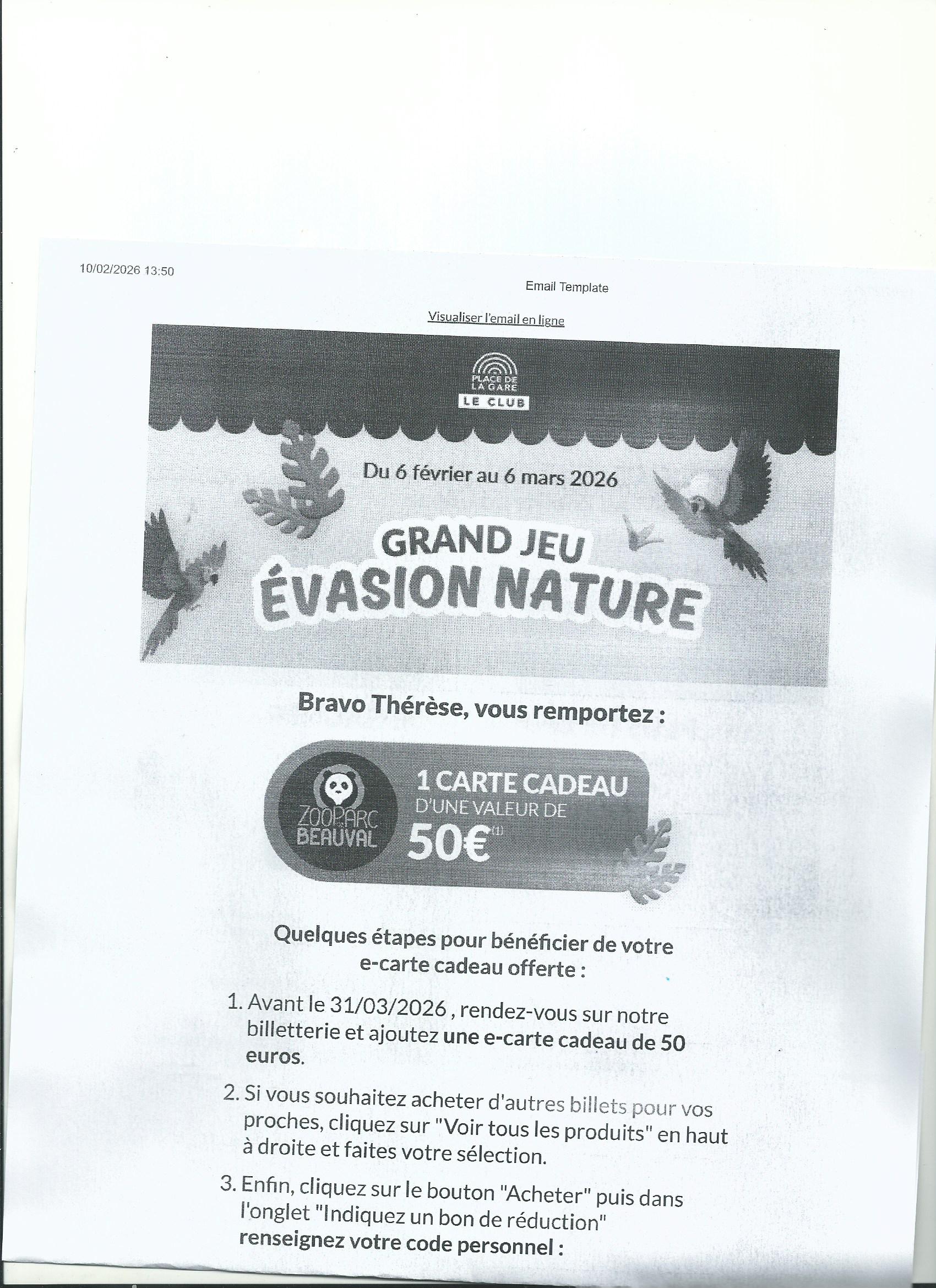 code pour l'achat d' une e-carte cadeau de 50 €, ZooParc Beauval