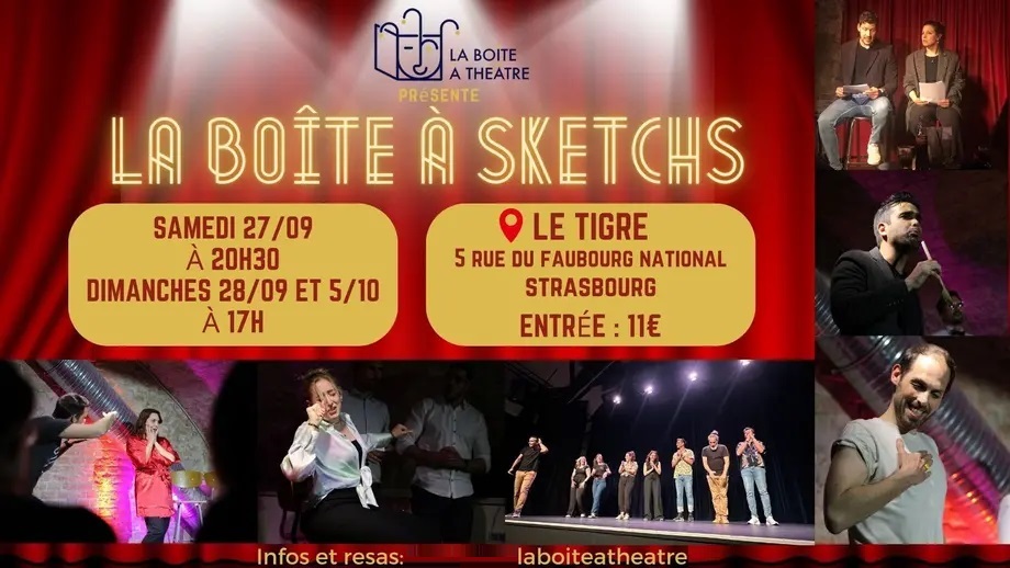 « Et c'est parti pour la saison 3 de la revue la plus déjantée de Strasbourg ! La Boîte à Sketchs, c'est toujours tous les mois UN NOUVEAU SPECTACLE !! (tellement on a des bêtises à raconter^^). Vie de famille, actu, sport, politique, Tv, tout y passe, personne n'est épargné dans cette soirée 100% humour. Comédiens du mois : Laeti, Butch, Estelle, Christ, Aurore, Fred. »