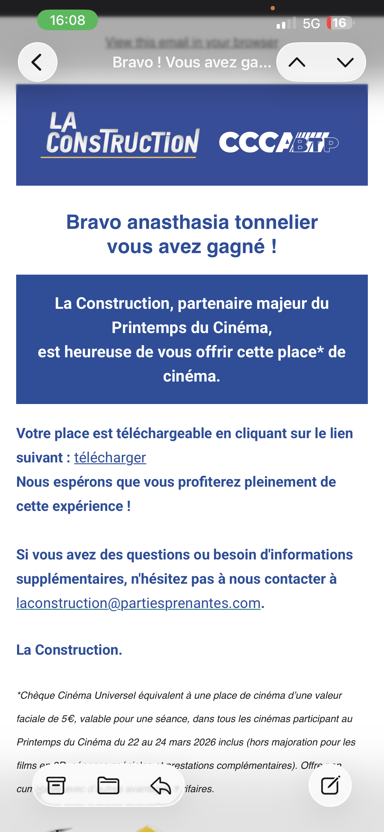 « Wahou trop contente mail reçu hier. »