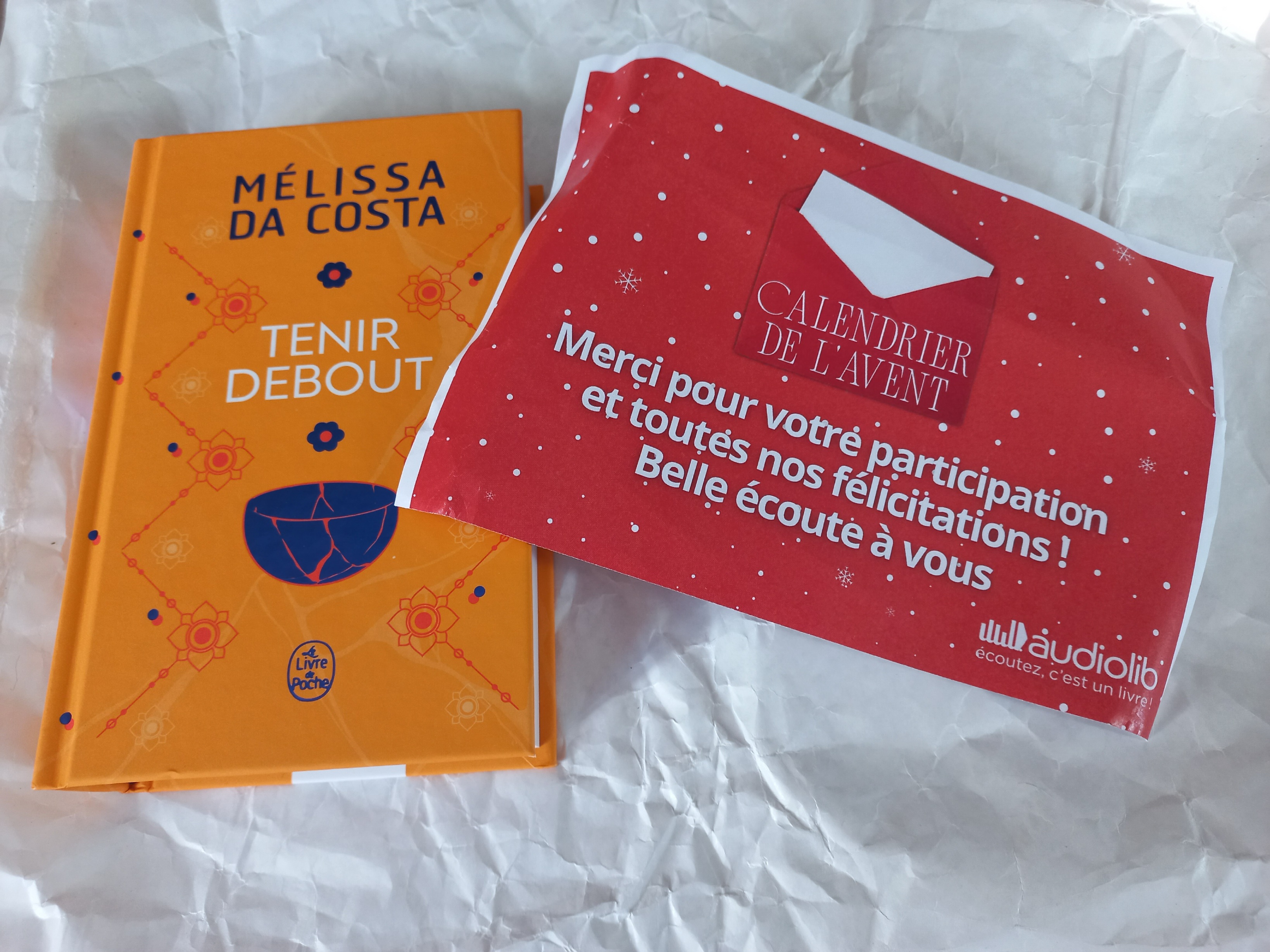 Le livre Tenir debout de Melissa Da Costa gagné avec Audiolib ainsi que le code audio reçu par mail il y a quelques jours
