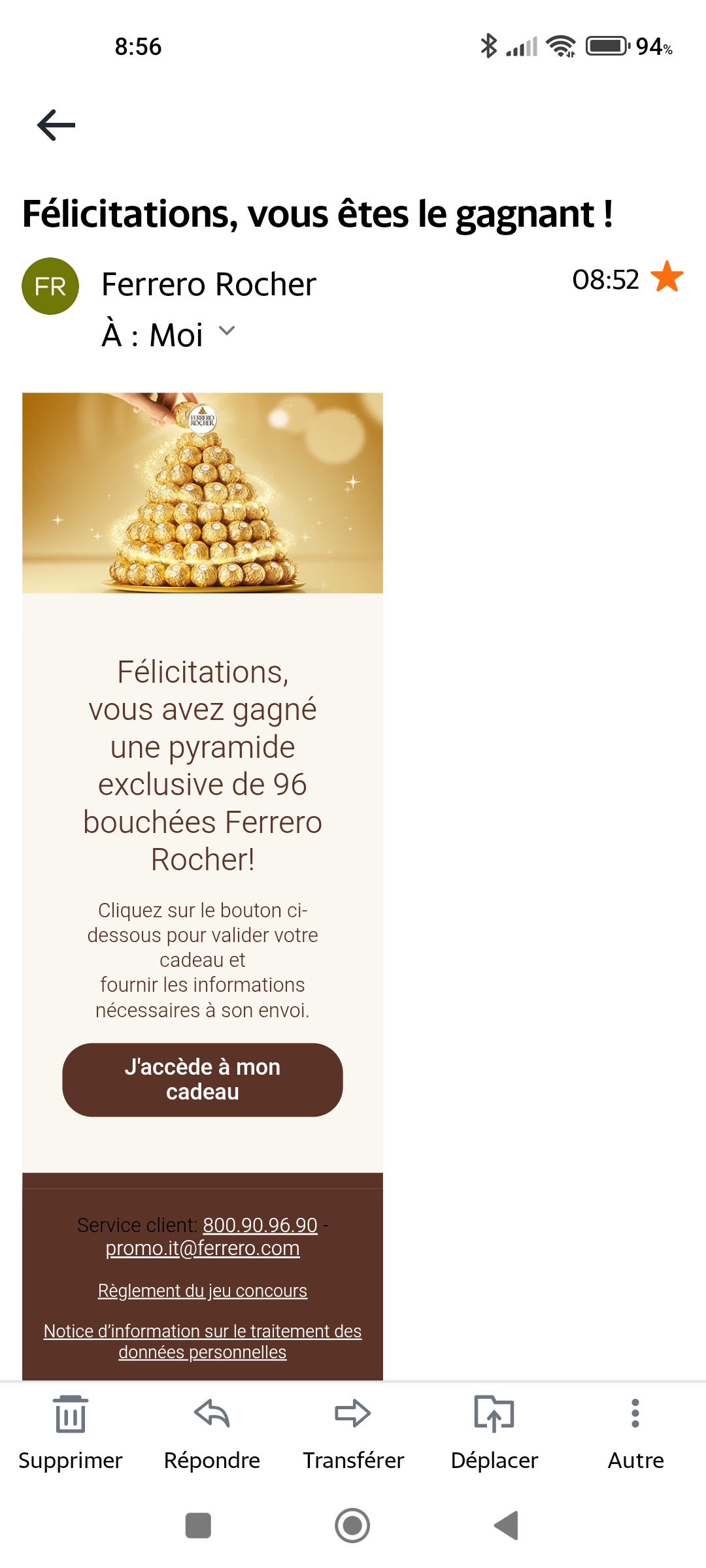 « Surprise en ouvrant la boîte aux lettres, je n’ai pas été informée et je n’ai pas souvenir d'avoir participé à un jeu concours pour ce gain »